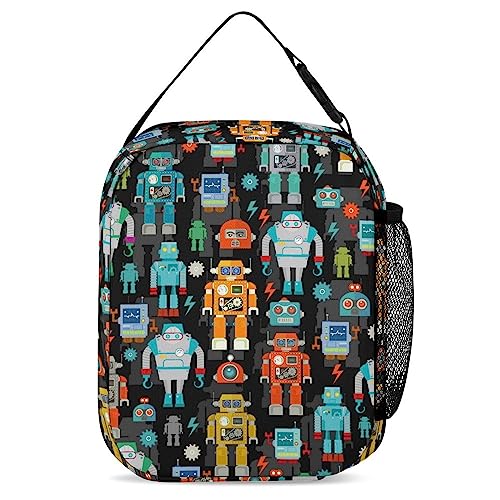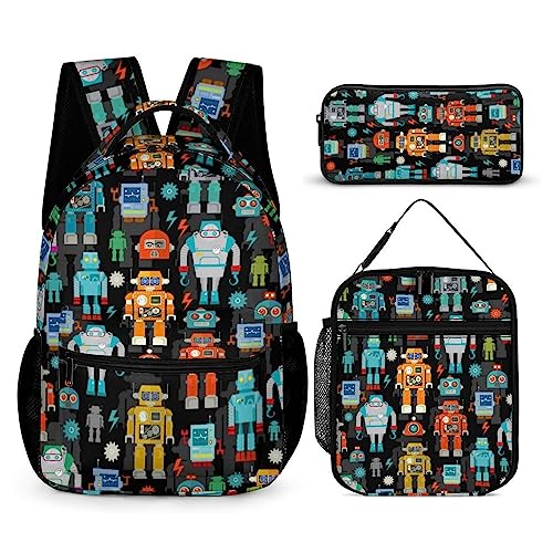 3PCS Cartoon Robots Backpack, Cute Shoulders Backpack Lightweight Durable Laptop Bag, 17 Inch Daypack with Multiple Pockets (Vintage Robots)